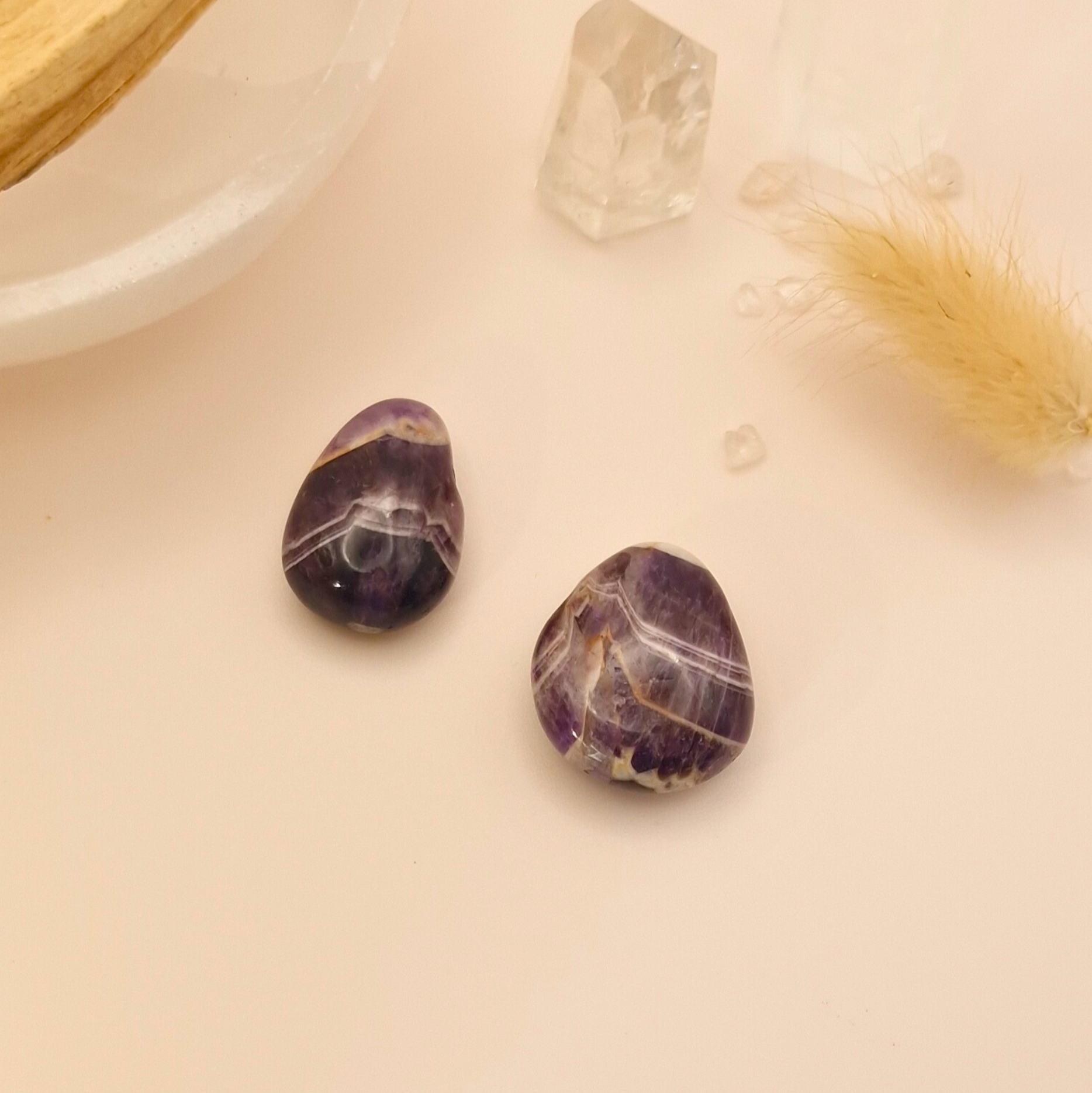 Ein gebohrter Amethyst in der Größe von ca. 3 cm x 2 cm, handverlesen und speziell für dich ausgesucht. Die Steine können in Farbe und Form variieren, da es sich um Naturprodukte handelt.